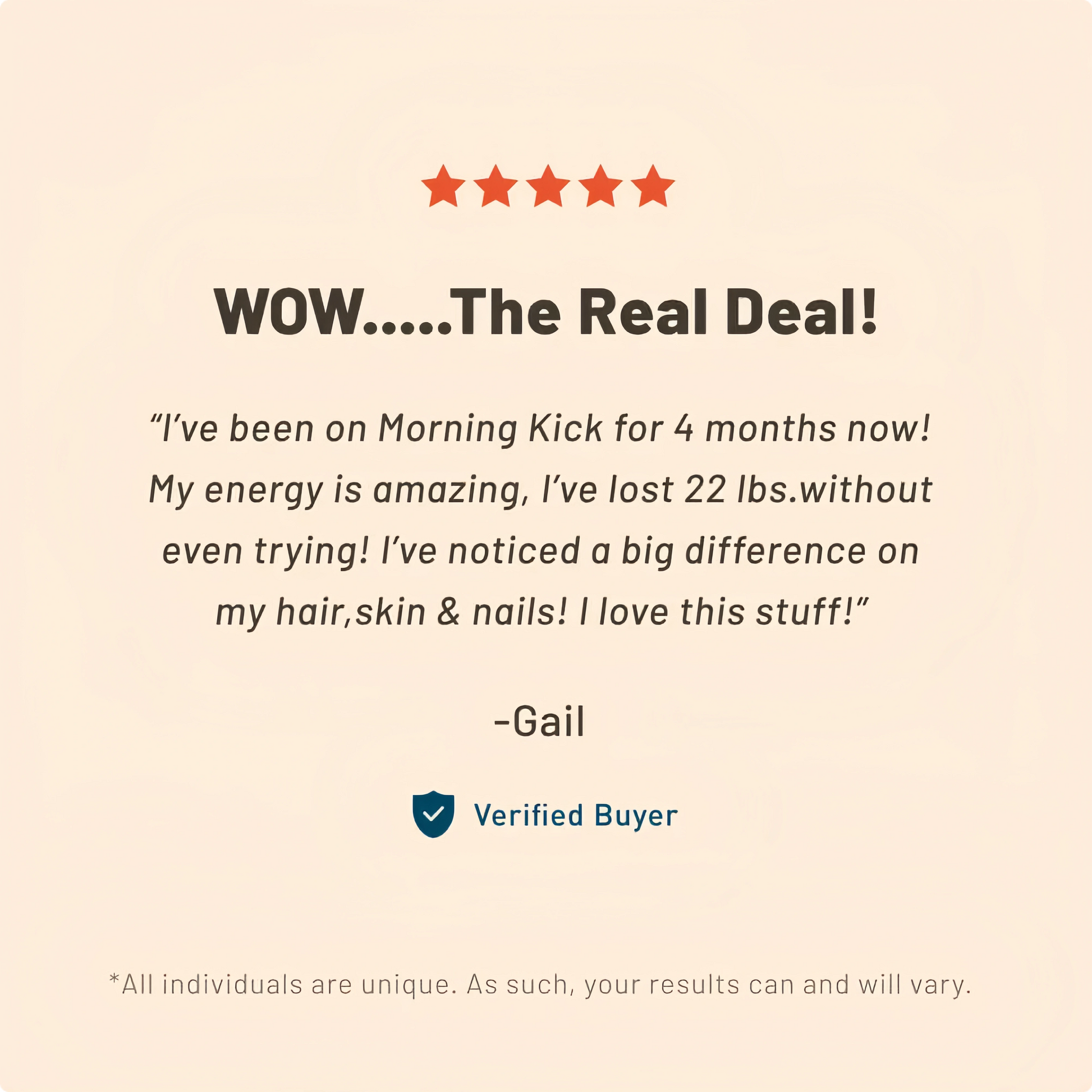 Morning Kick® is designed to combat fatigue, bloating, indigestion, occasional joint and muscle discomfort, brain fog, weight gain, and other so-called “signs of aging.”†*